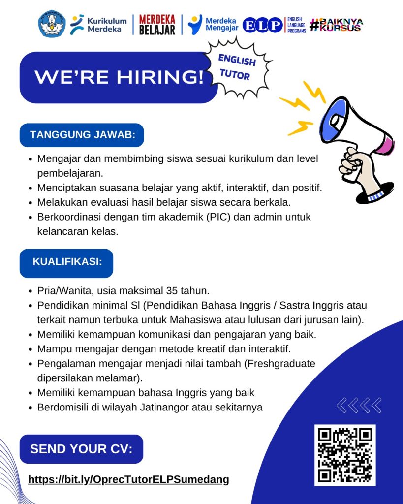 Memiliki skill Bahasa Inggris yang mumpuni? Jangan simpan untuk diri sendiri! Bagikan ilmu Anda dan bangun komunitas pembelajar yang hebat bersama kami. Kami tunggu kehadiran Anda di tim kami!.